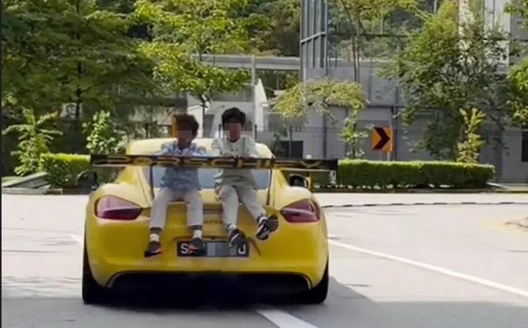 而第二段视频源自Tiktok上的视频。画面是从车后拍摄,两位印裔小朋友坐在车厢上方,手扶着保时捷尾翼。保时捷在缓慢前行,并在前方弯道处转弯。