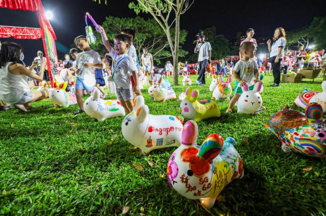 配合SG60,今年的活动现场展出了由居民彩绘的60个充气兔子装置。 (陈斌勤摄)