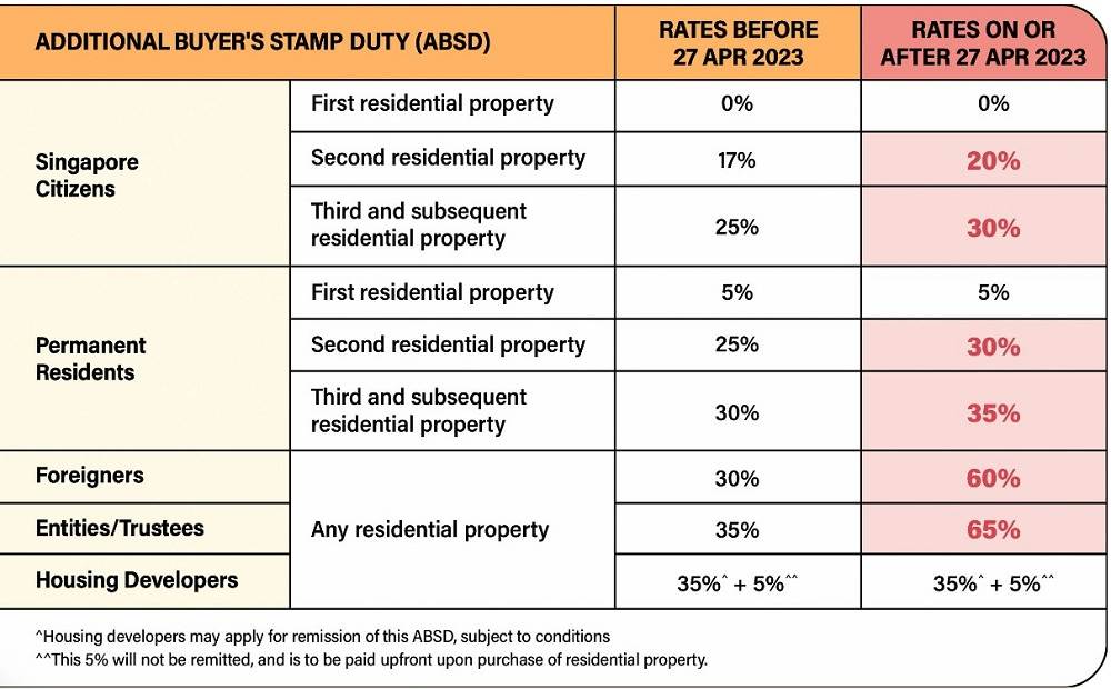 最新一次的ABSD税率调整发生在2023年4月,除了公民和PR购买第一套房产要交的ABSD保持不变外,其他情况均有不同上涨。