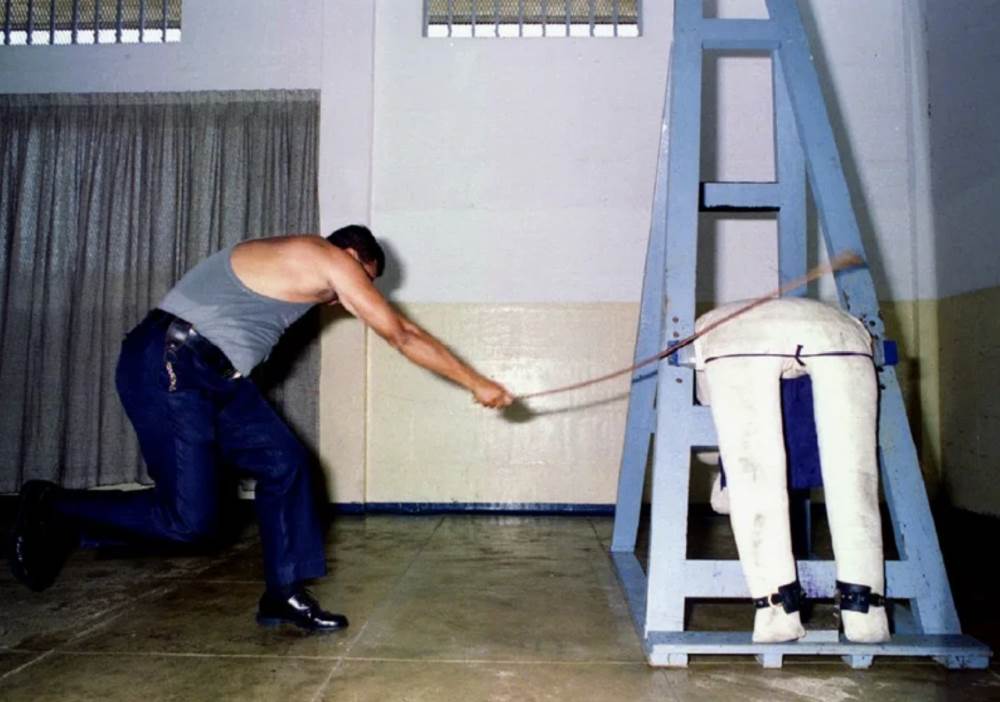 2 公尺长、1.27 釐米粗的藤鞭抽打罪犯的臀部。一份新加坡律师报告指出,只要鞭打 3 下便会皮开肉绽,随後逐渐虚弱无力。