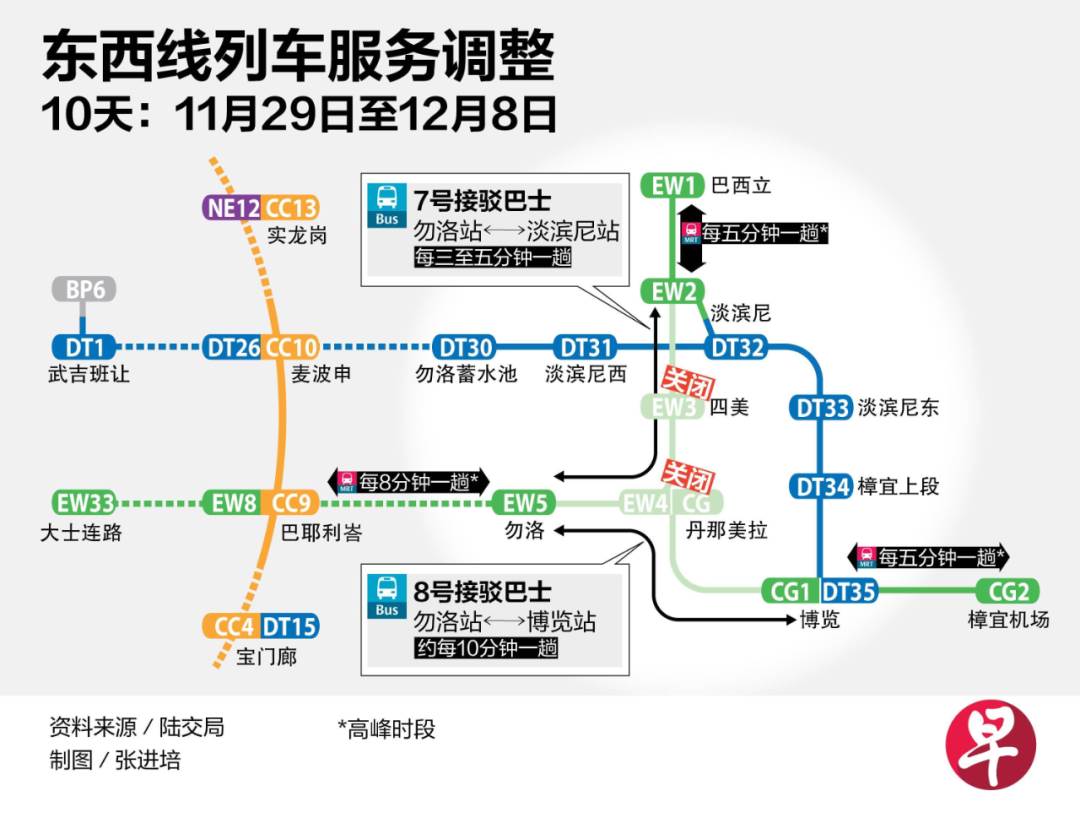 陆路交通管理局和地铁业者SMRT10月3日发文告说,11月29日至12月8日,四美站和丹那美拉站将关闭,巴耶利峇站之后的东西线列车服务将分三段接驳列车运行,列车行驶速度也将放慢。