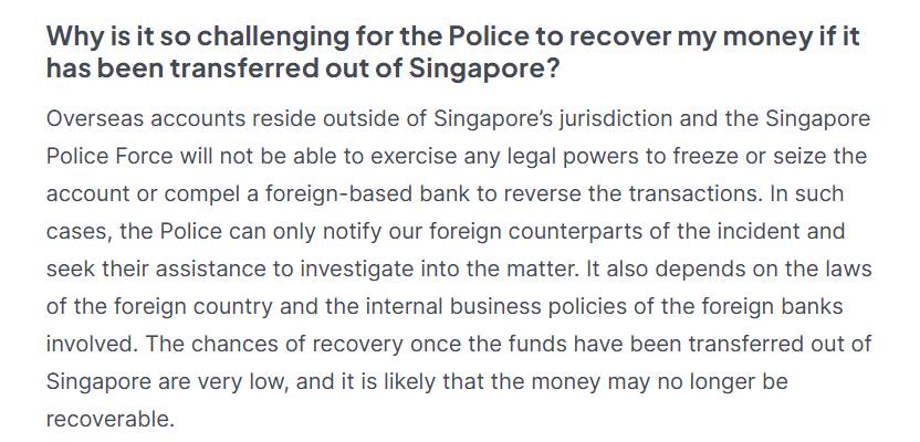 因为新加坡警察部队无权冻结或扣押海外账户或强制外国银行撤销交易。在这种情况下,警方只能寻求外国同行的协助调查。