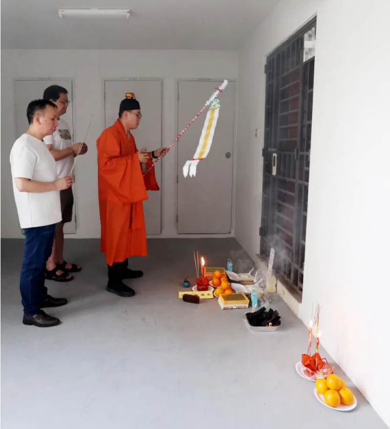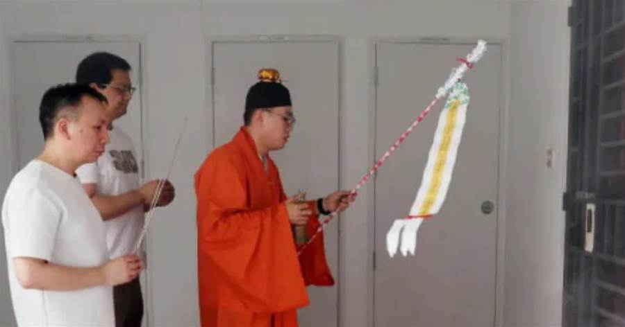 莫先生透露,他先前曾询问徐娜在法国的同事,但无法确定她的宗教信仰,他就按照本地的华人传统,上述法事是由天富宫负责,并找来显灵道坛的陈玟嘉师傅进行仪式。法事开始之后,莫先生和宋先生在师傅带领下,手持清香在门前祭拜,而师傅则手持招魂幡诵经。过后两人也在大师带领下,拿著一叠金银纸到楼下焚烧。